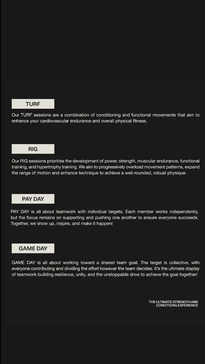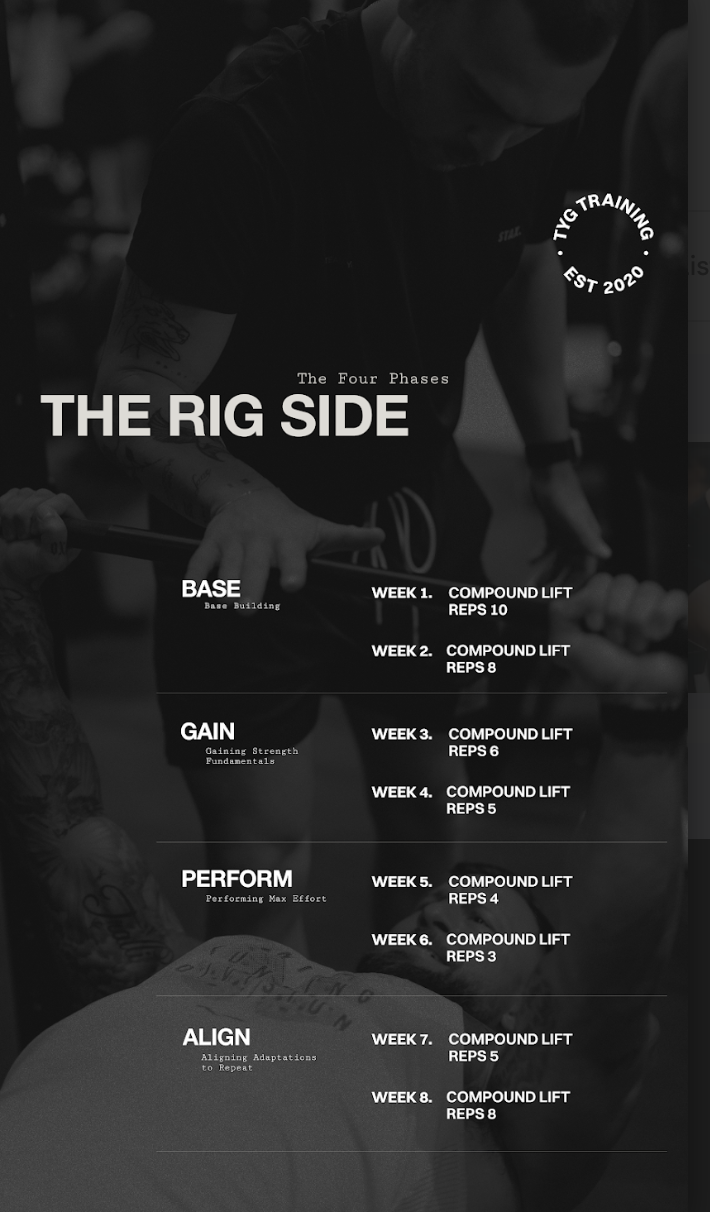 At TYG, we have built an 8-week training block designed to deliver a balanced Strength and Conditioning experience across both RIG and TURF. Using a structured, progressive approach, it’s crafted to improve performance while remaining accessible to all fitness levels.